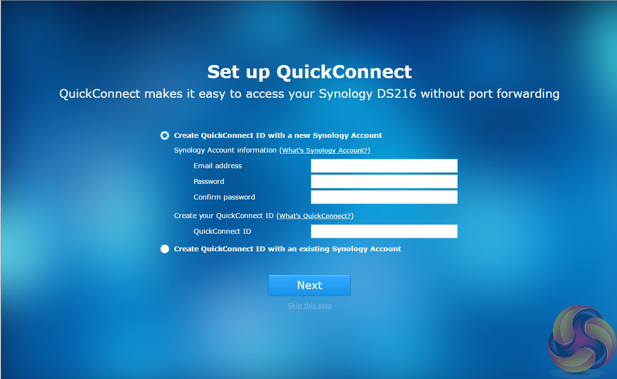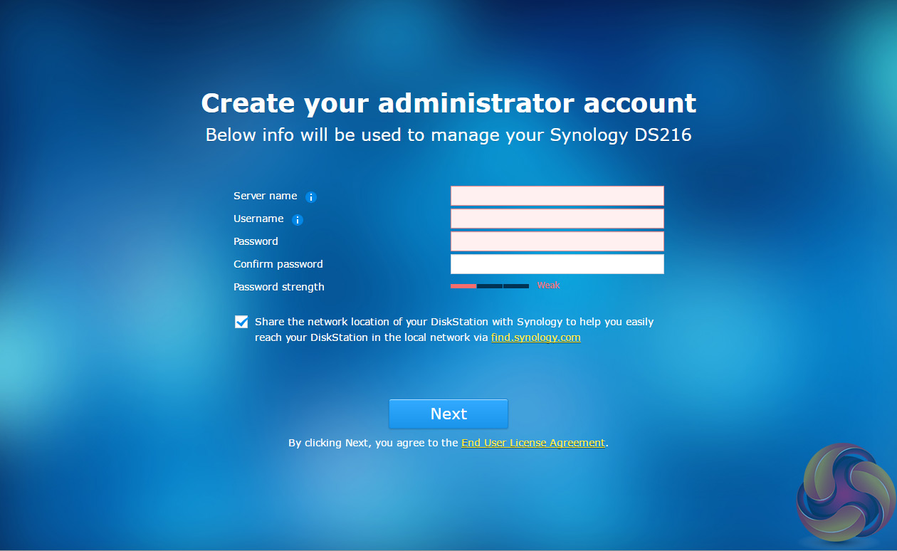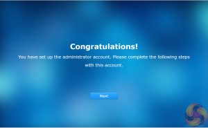 After the basic install has finished, the NAS is restarted and next up comes the setting up of the NAS management, where you assign a server name, admin user name and password.