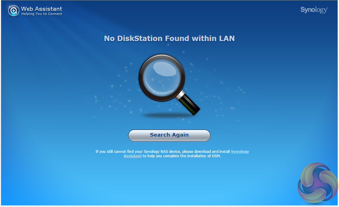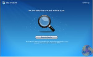 The first part of setting up the ioSafe 216 is to go to http://find.synology.com which launches Web Assistant. This app searches for all DiskStations on the network so you can begin the install. If this method fails to find the NAS, the App has a link to the Synology Download Center where you can download the Synology Assistant to your PC to search again for the NAS.