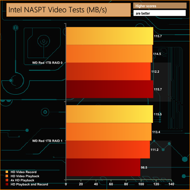 Once again consistency is the key word for the ioSafe 216 when it comes to the video tests of Intel's NASPT benchmark. The only time the performance drops back below 100MB/s is during the HD Playback & Record test in RAID 1.