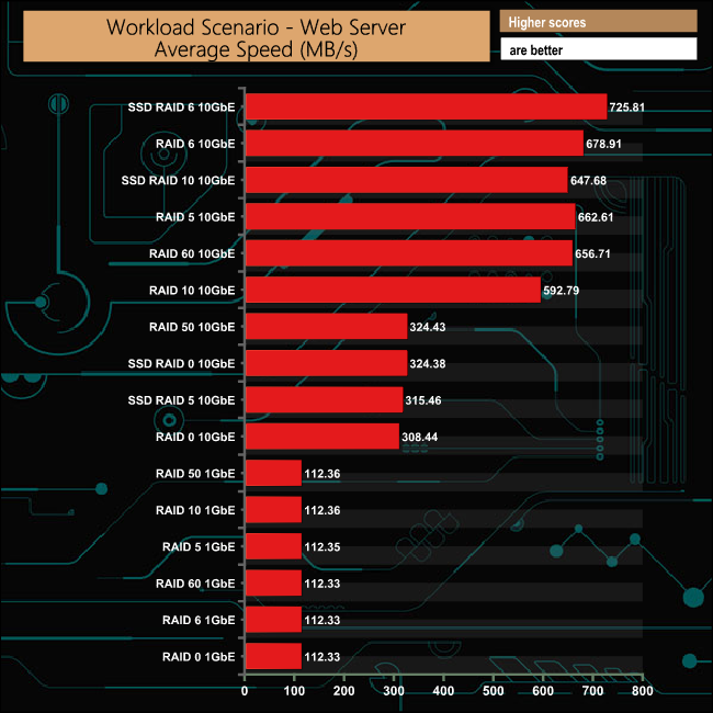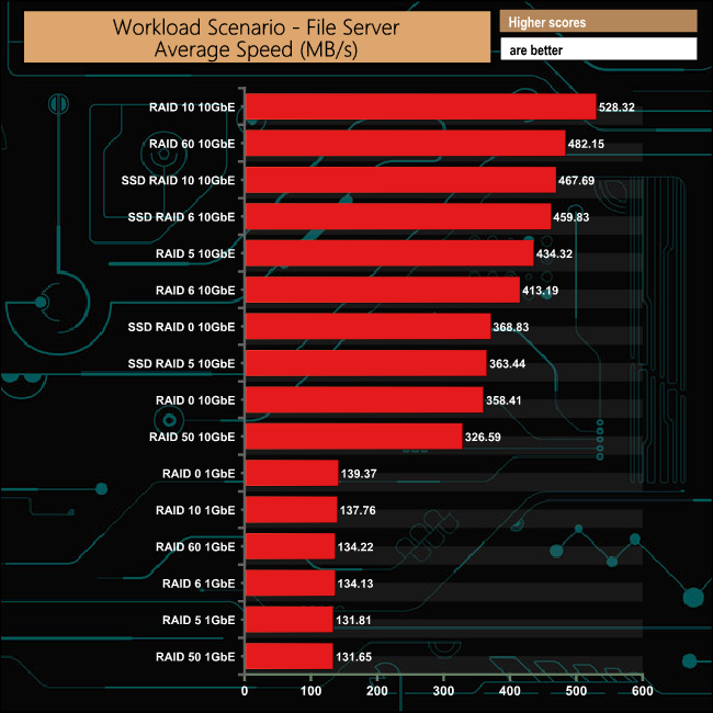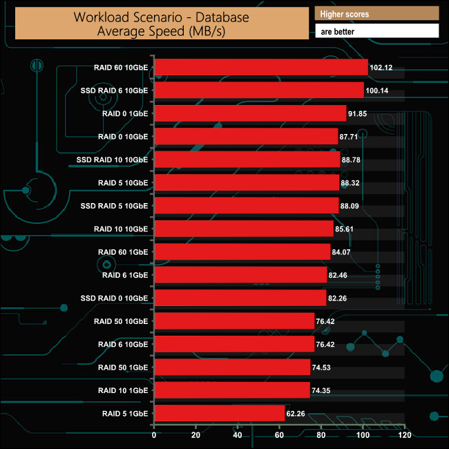 While the File and Web server tests produced much faster average speeds when using a 10GbE connection, the Database test produced results that were a lot closer between the two connection speeds.
