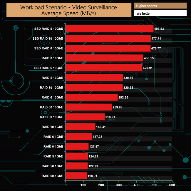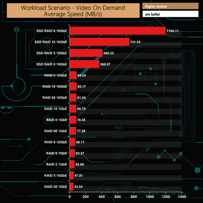 The fastest performance in the second group of workload scenarios came in the Video On Demand test with the SSDs in a RAID 6 array with a stunning 1,194.11MB/s. Not far behind was the RAID 6 performance in the media streaming test at 1,097.36MB/s.