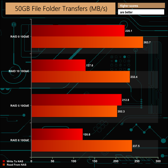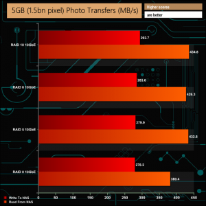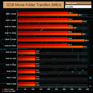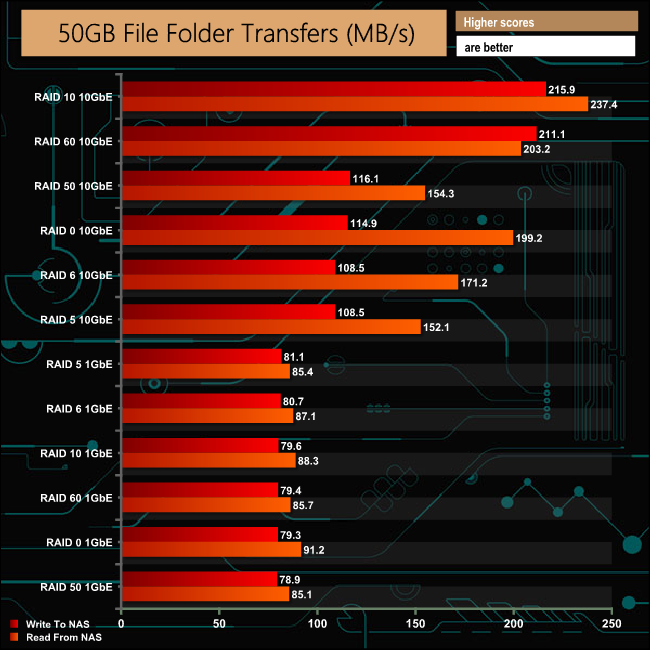 To test real life file/folder performance we use a number of different file/folder combinations to test the read and write performance of the NAS device. Using the FastCopy utility to get a MB/s and time taken for each transfer, the data is written from and read back to a 240GB SSD.