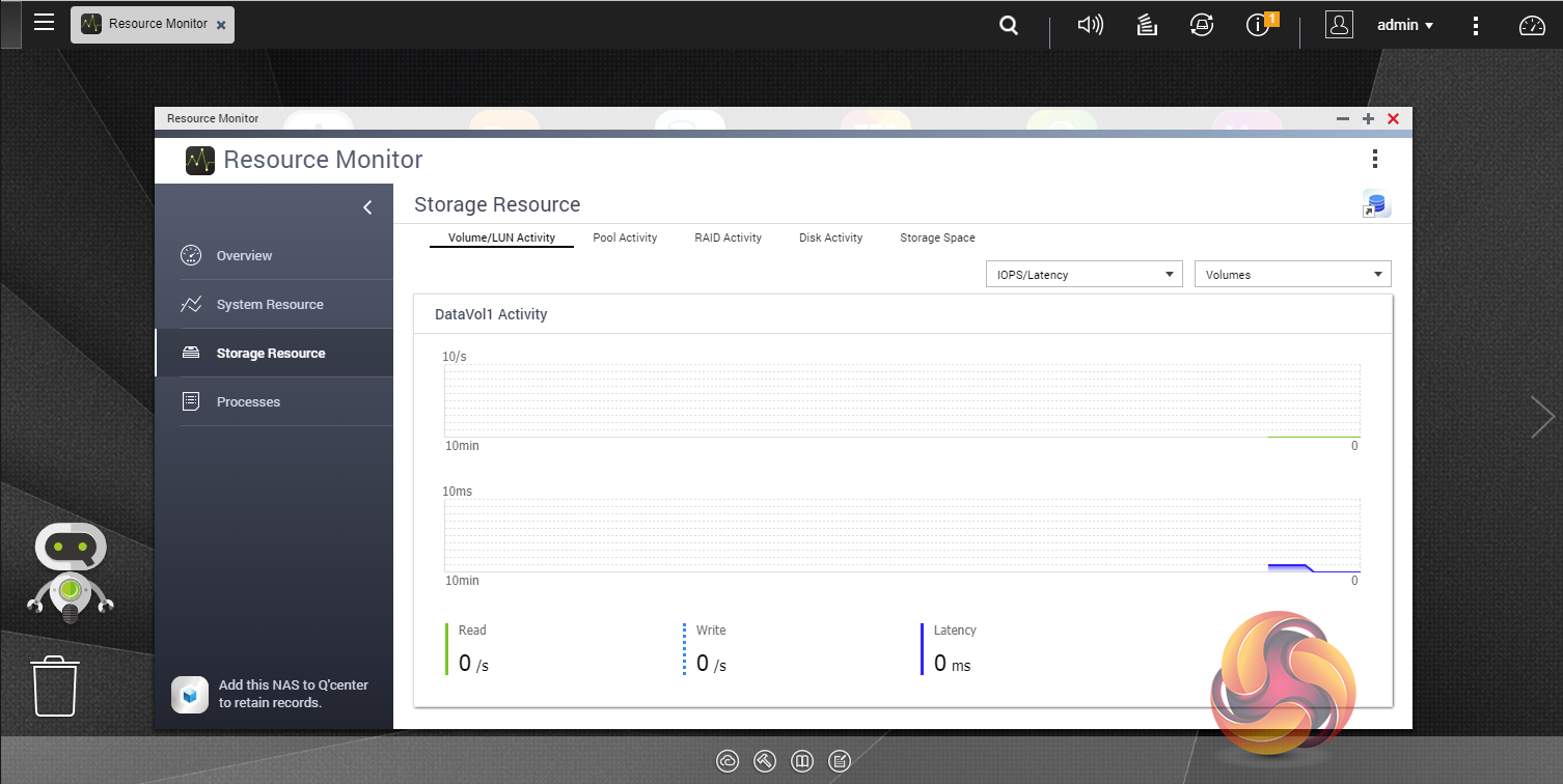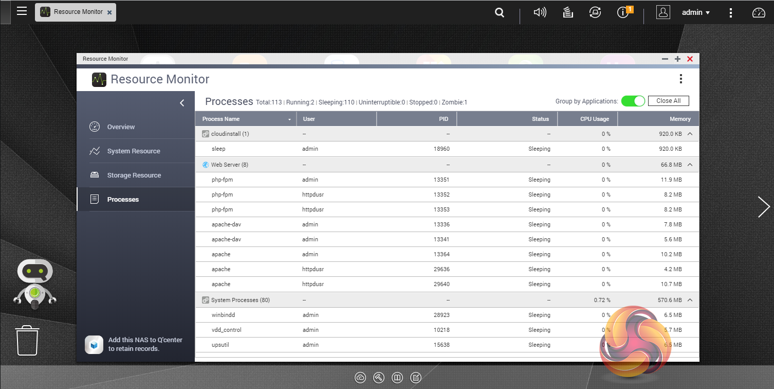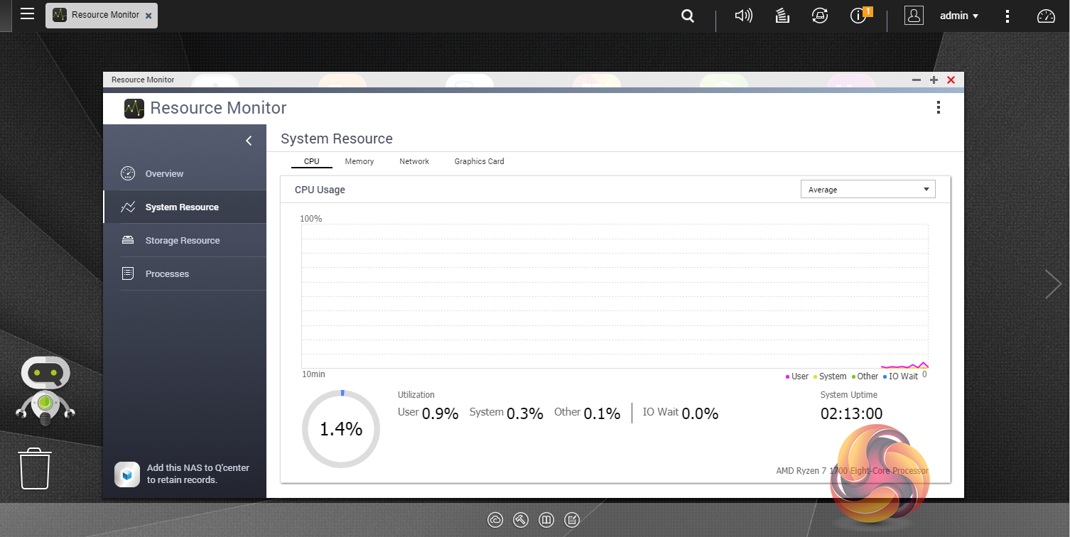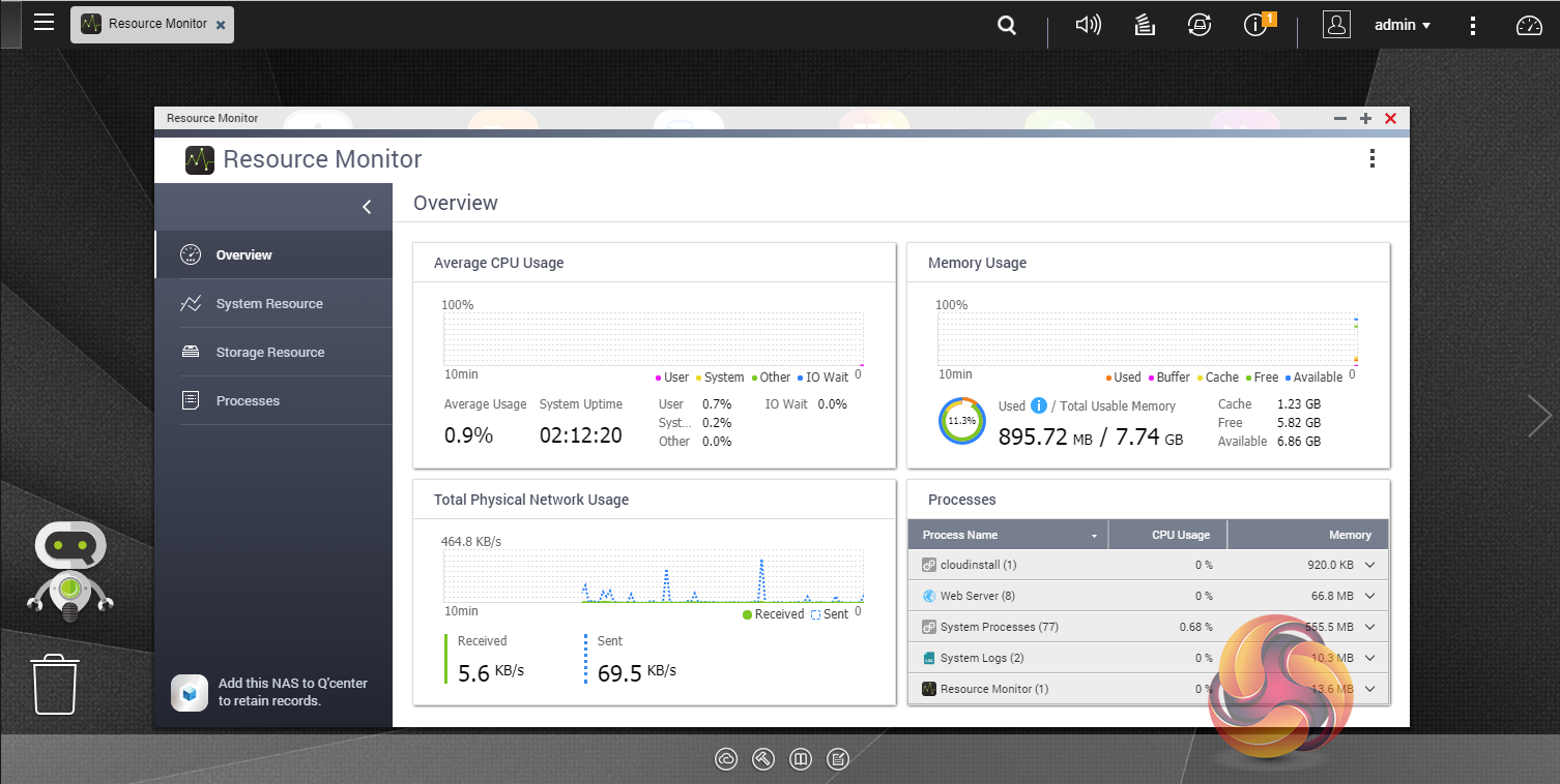The Resource Monitor is a very useful tool, monitoring elements and offering detailed information on how the storage of the NAS is being used. It is divided into four sections; Overview, System (with separate tabs for the CPU, Memory and Network), Storage (with separate pages for pool, RAID and disk activities and how the storage space is being used) and Processes.