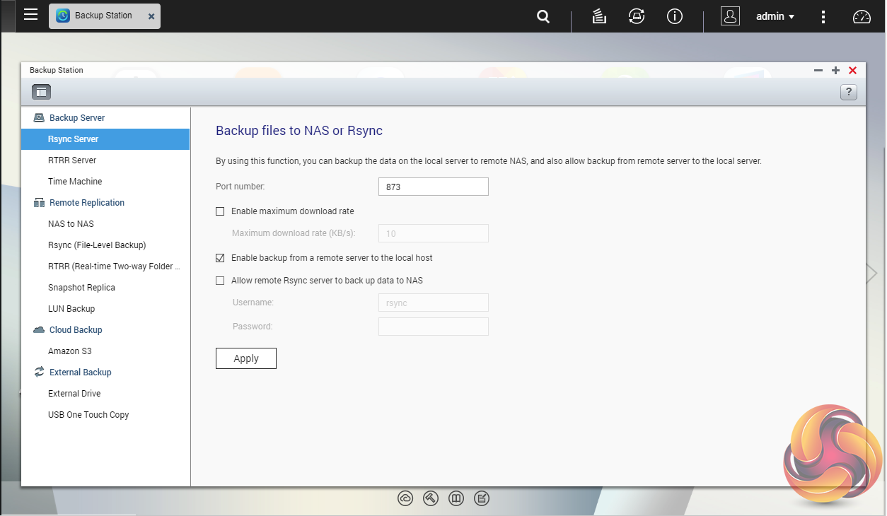 Backup Station allows the backing up of data with a wide range of options, including backup servers, cloud storage, and external devices. The One Touch button on the front bezel can be set up to either upload or download files/folders or backup the NAS to an external USB drive. In the Backup Station pages in the QTS you can set up exactly what you want the One Touch system to do.