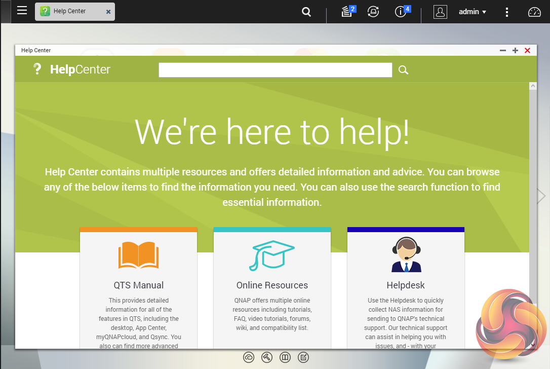 When you access the NAS for the first time you are met by the HelpCenter app. This comprehensive help utility provides access to the QTS manual, Online Resources including tutorials, video tutorials, FAQs and forums – or if all else fails you can connect to the QNAP Helpdesk for technical support. If you don't want to see this page every time you access the NAS, don't forget to uncheck the ‘show on startup' option.