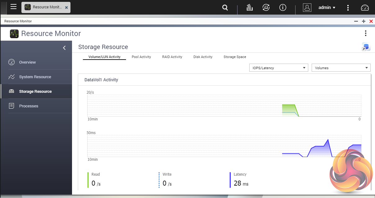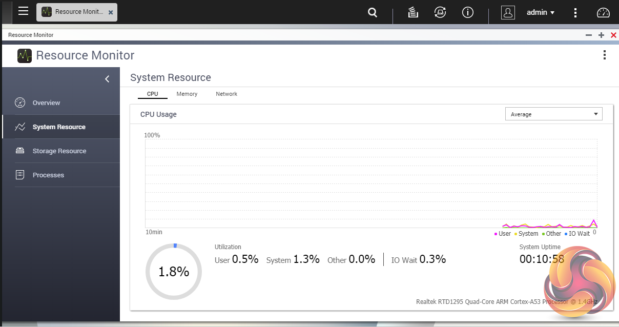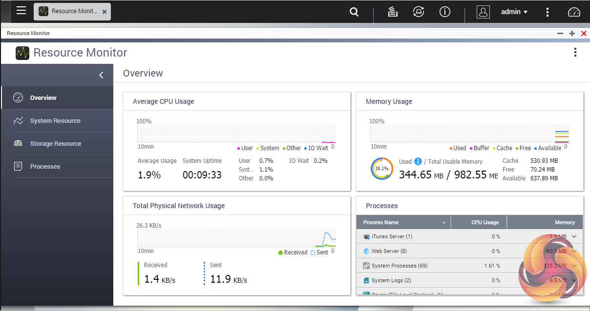 The Resource Monitor is a very useful tool, monitoring elements and offering detailed information on how the storage of the NAS is being used. It is divided into four sections; Overview, System (with separate tabs for the CPU, Memory and Network), Storage (with separate pages for pool, RAID and disk activities and how the storage space is being used) and Processes.