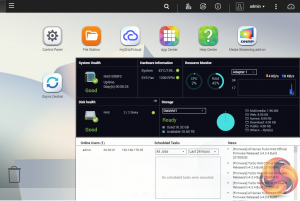 Clicking the icon in the top right of the screen activates the Dashboard page which gives a snapshot of what’s happening with the NAS.