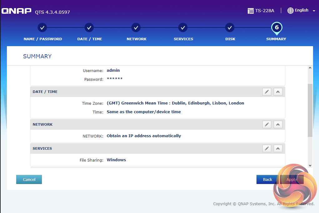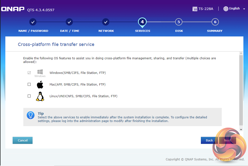 During the setup you can enable which OS cross-platform file management service you require – Windows (SMB/CIFS, File Station, FTP), Mac (SMB/CIFS, File Station, FTP) and Linux (NFS, SMB/CIFS, File Station, FTP).