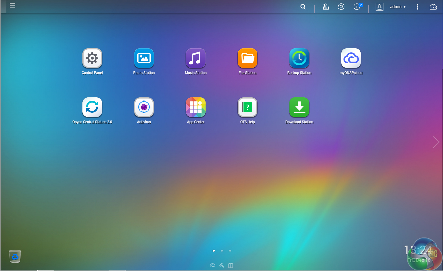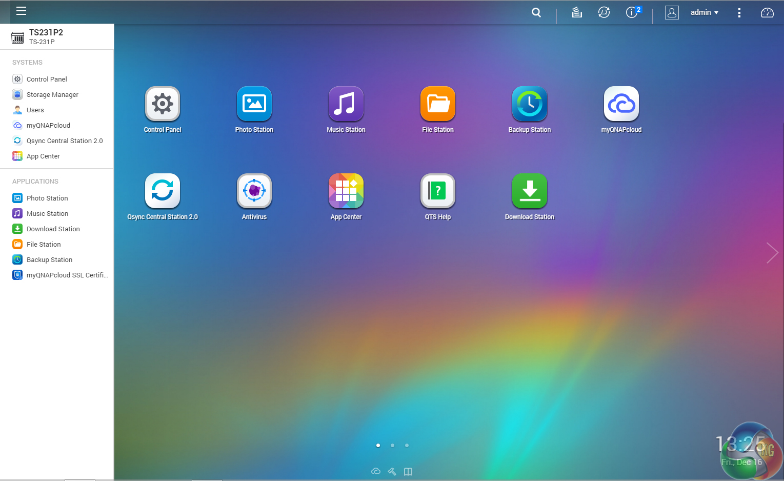 QTS is a graphically-rich OS with the major apps appearing as icons on the main page. Clicking on the ‘hamburger‘ menu icon at the top left-hand side of the screen drops down a very useful side menu. Clicking the icon on the top right of the screen activates the Dashboard page which gives a snapshot of what’s happening with the NAS.