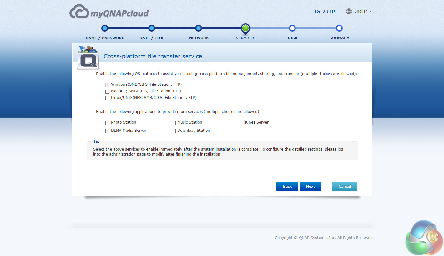 Whichever way you choose to start, it's just a simple matter of following the install wizard. During the setup you can enable which OS cross-platform file management service you require; Windows (SMB/CIFS, File Station, FTP), Mac (SMB/CIFS, File Station, FTP) and Linux (NFS, SMB/CIFS, File Station, FTP). At this stage you can also load a few basic apps; Photo Station, Music Station, iTunes Server, DLNA Media Server and Download Station.
