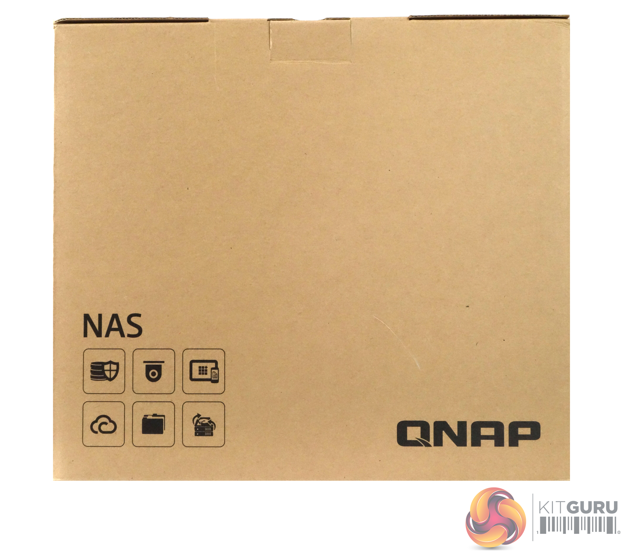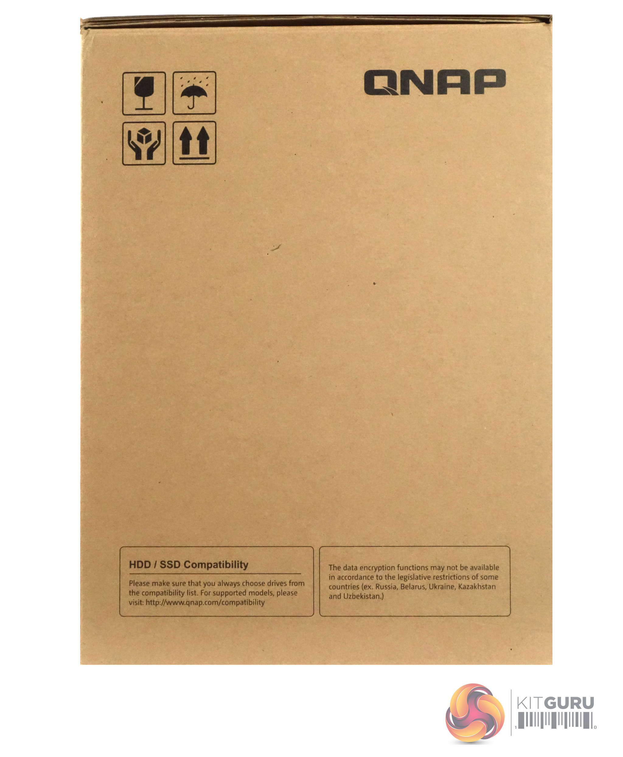 One side of the box has carriage icons on the top left and an HDD compatibility panel on the bottom. The other side just has a double row of carriage and storage icons and marks of the various standards the NAS passes.