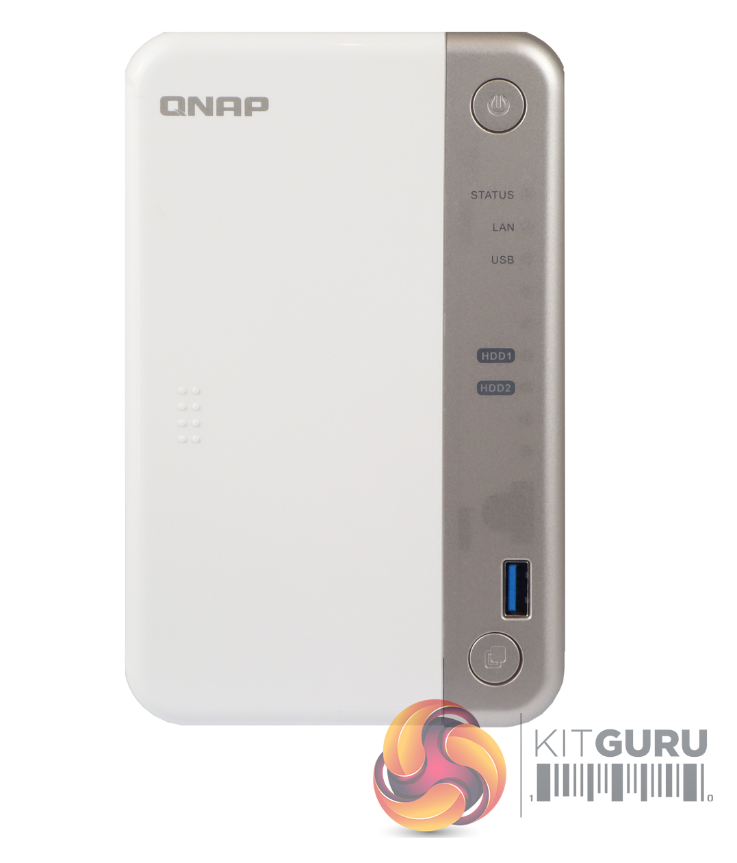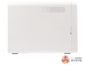 QNAP’s TS-251B is a compact and quite attractive looking 2-bay NAS with its white front bezel and side panels. The silver grey front panel holds the power and USB copy buttons and the five indicator LEDs (reading from top to bottom they are: status, LAN, USB and two for drive activity).