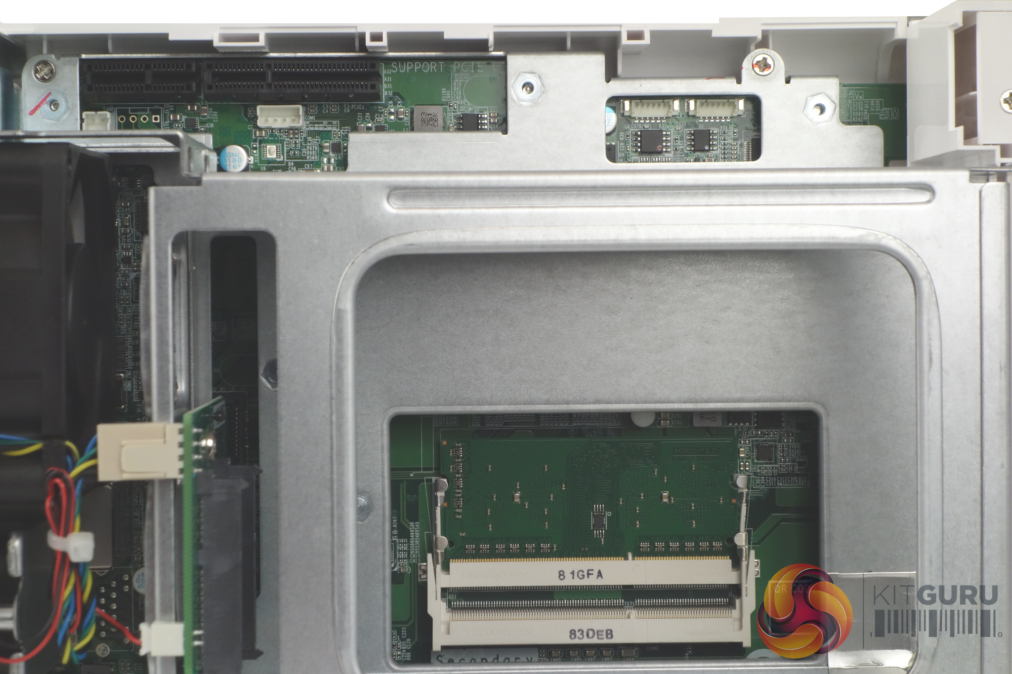 To access the memory DIMM slots and the PCIe slot you have to separate the two halves of the housing. This is a simple job that just involves removing two screws in the rear panel (top and bottom) and sliding the two sides apart. There is an indicator to show which way the unit unlocks sitting under the quick start label on the bottom of the unit.
