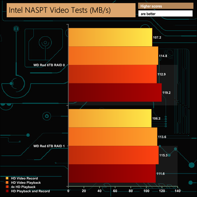 The TS-251B performs well in the video tests of Intel's NASPT benchmark with over 100MB/s results for all the tests, and in both arrays.