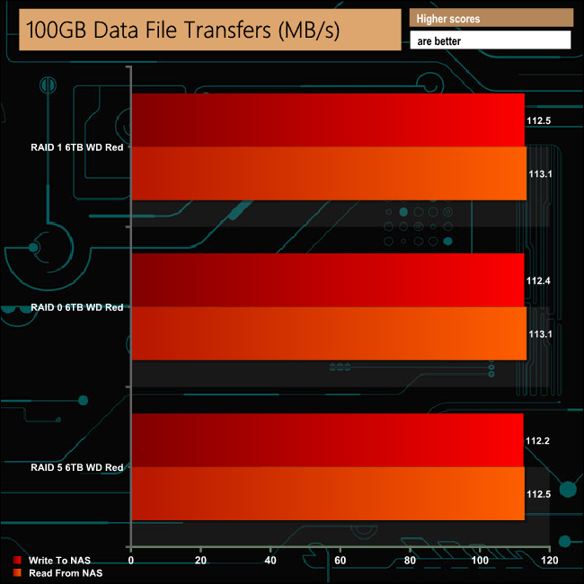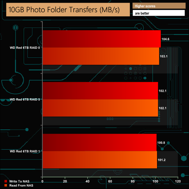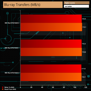 The TS-328 showed good consistency throughout our real life data transfer tests. Having said that there were a couple of times when the RAID 5 read performance dipped a little compared to RAID 1. In the 10GB Audio file transfer there was a 10MB/s difference between the RAID 1 and 5 read performance and in the 5GB Photo transfer the difference was 9.6MB/s.