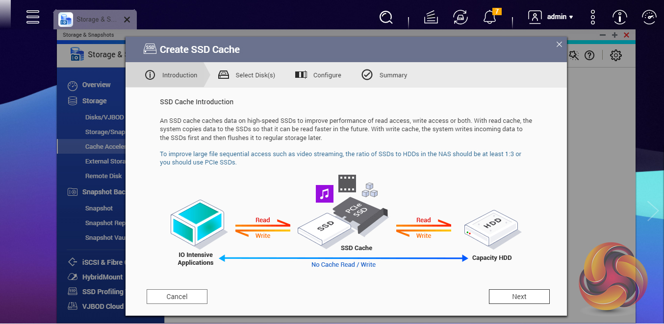 Setting up SSD caching duties is really straightforward thanks to QNAP's easy to follow wizard in the Cache Acceleration subsection of the Storage & Snapshots element of the QTS OS. The cache can be set up as read-only, write-only or read-write using a single drive or a pair built into a RAID array.