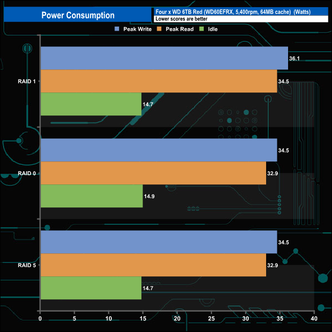 The lntel Celeron N5105 quad-core processor that powers the TS-364 has a 10W TDP. QNAP quote a typical operating power consumption figure of 32.8W for the TS-364. To test the unit we used three 6TB WD Red drives (WD60EFRX) which are rated at 5.3W (active read/write), 3.4W (idle) and 0.4W sleep which gave figures in the ballpark of the official ratings.