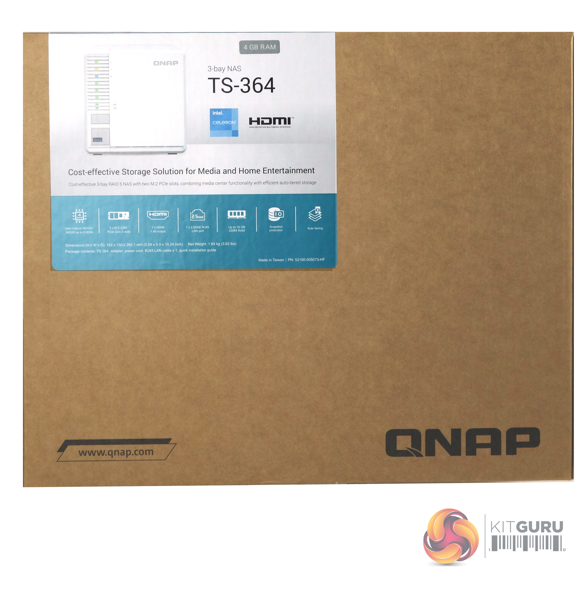 The TS-364 comes in a compact box with an image of the drive on the front label. A sticker on the top right of the label displays the amount of memory the unit comes with (4GB). Under the image is a couple of lines of text about what the NAS can do and under this is a row of icons listing some of the TS-364’s features; Quad-core CPU, 2 M.2280 slots, 1.4b HDMI output, 2.5GbE, supports up to 16GB of DDR4 memory, Snapshot protection and auto-tiering.