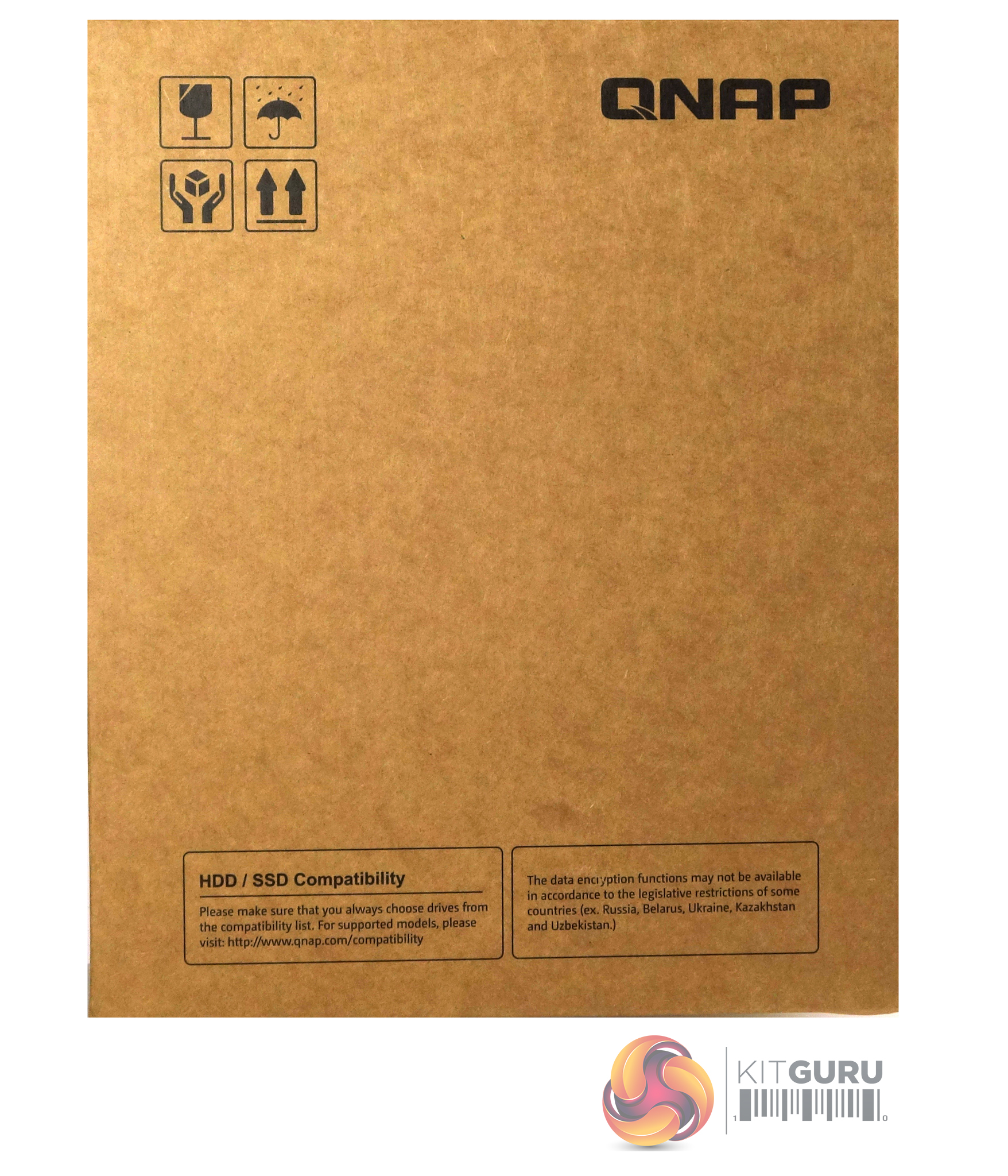 One side of the box has carriage icons on the top right and an HDD/SSD compatibility panel on the bottom. The other side just has a double row of carriage and storage icons and marks of the various standards the NAS passes.