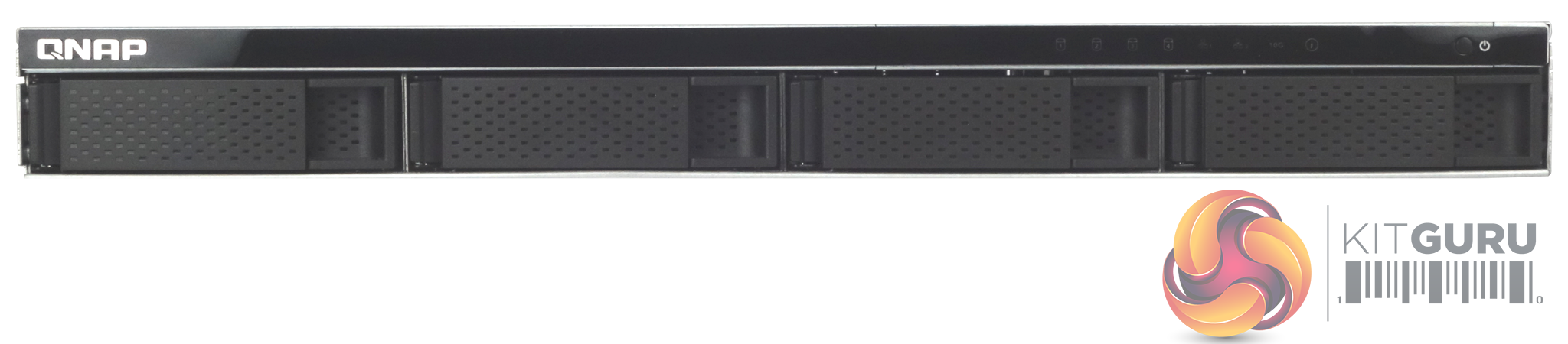 Along the top right hand side of the NAS above the drive bays sit the power button and indicator LEDs. There are four drive activity indicators, a pair for the two 1GbE ports, a separate one for the 10GbE connection and finally a Status LED.