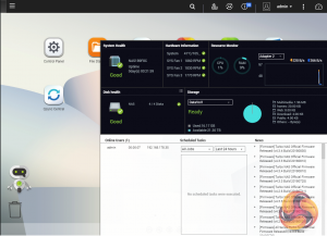 Clicking the icon on the top right of the screen activates the Dashboard page which gives a snapshot of what’s happening with the NAS.