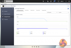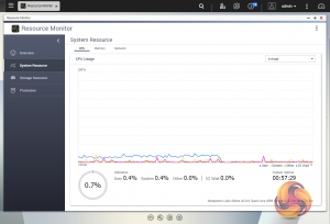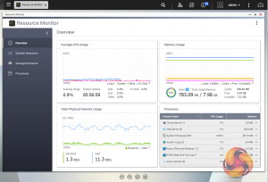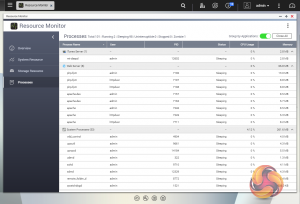 The Resource Monitor is a very useful tool, monitoring elements and offering detailed information on how the storage of the NAS is being used. It is divided into four sections; Overview, System (with separate tabs for the CPU, Memory and Network), Storage (with separate pages for pool, RAID and disk activities and how the storage space is being used) and Processes.