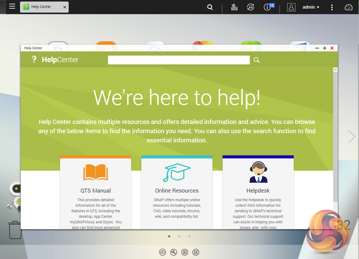 When you access the NAS for the first time you are met by the HelpCenter app. This comprehensive help utility provides access to the QTS manual, Online Resources including tutorials, video tutorials, FAQs and forums – or if all else fails you can connect to the QNAP Helpdesk for technical support.