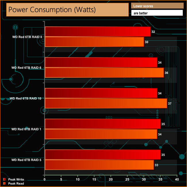 We tested the peak power consumption of a NAS at the wall during a run of CrystalDiskMark 5.0.2 as this version of the benchmark runs the read and write benchmark suites separately, so it is easier to monitor what power the device is using during each function.