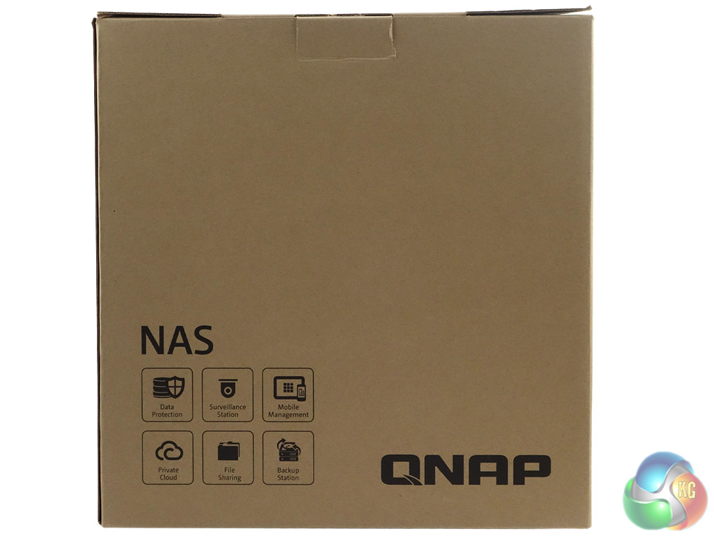 The TS-451A-4G comes in a large brown box with a small label on the front which has an image of the NAS and the model's memory capacity and two panels. The rear of the box just has a group of icons displaying some of the major utilities; Data Protection, Private Cloud, File Sharing, Backup Station, Surveillance Station and Mobile Mangement.