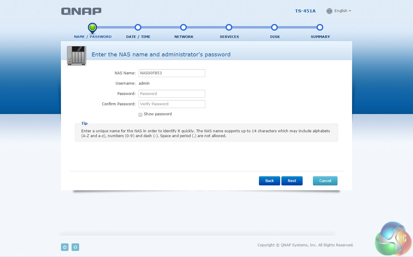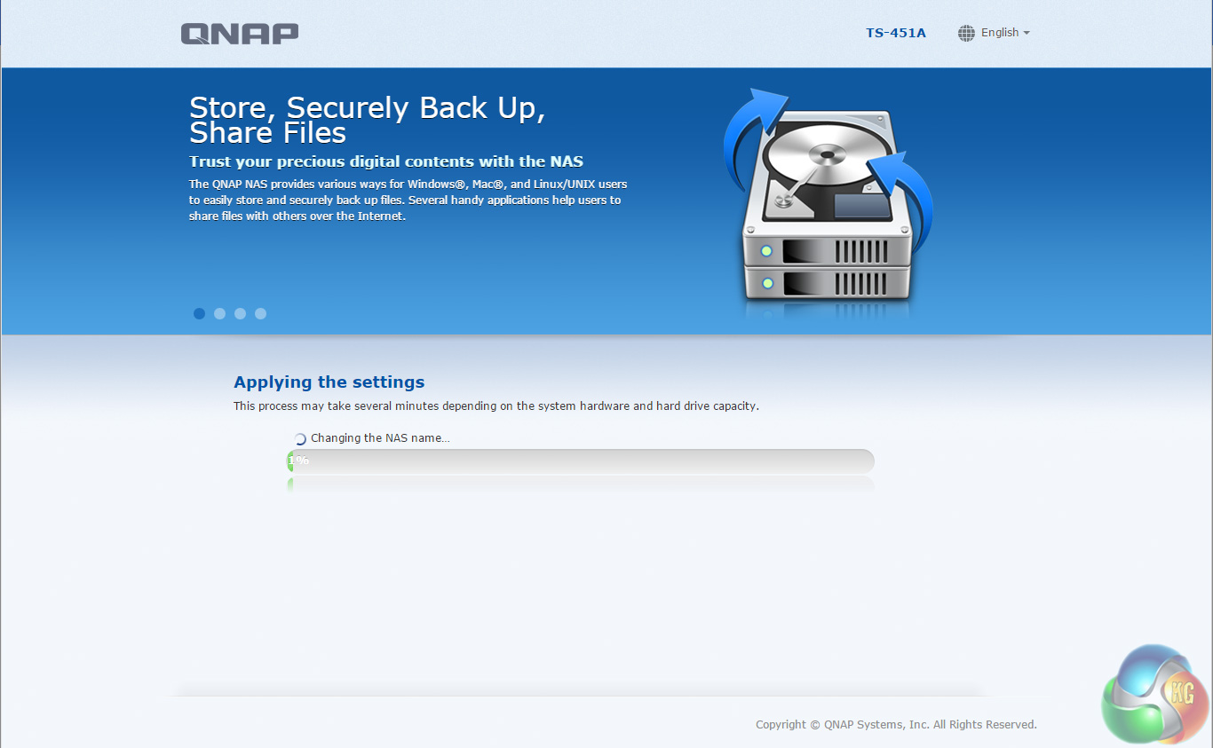 The default setup for the TS-451A-4G with four disks is RAID 5. It takes around 20 minutes to get the NAS set up and ready to use but obviously longer to get the disks synchronised (it took around 15 hours to synchronise the 4 6TB disks we were using for testing in a RAID 5 array). Once the NAS is set up, clicking on the NAS in the QFinder Pro brings up the log in screen.