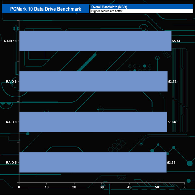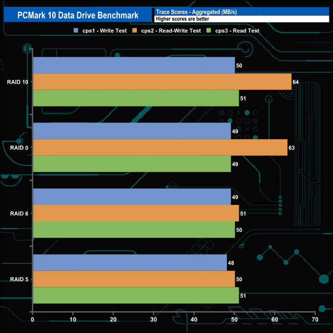The fastest performance from the test traces came using a RAID 10 array and the cps2 Read-Write test (64MB/s) very closely followed by the RAID 0 result of 63MB/s. Apart from these two results, all the others displayed a very high level of consistency across the tested RAID arrays.