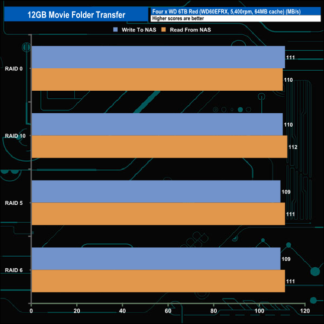 To test real-life file/folder performance we use a number of different file/folder combinations to test the read and write performance of the NAS device. Using the FastCopy utility to get an MB/s and time taken for each transfer, the data is written from and read back to a 240GB SSD.
