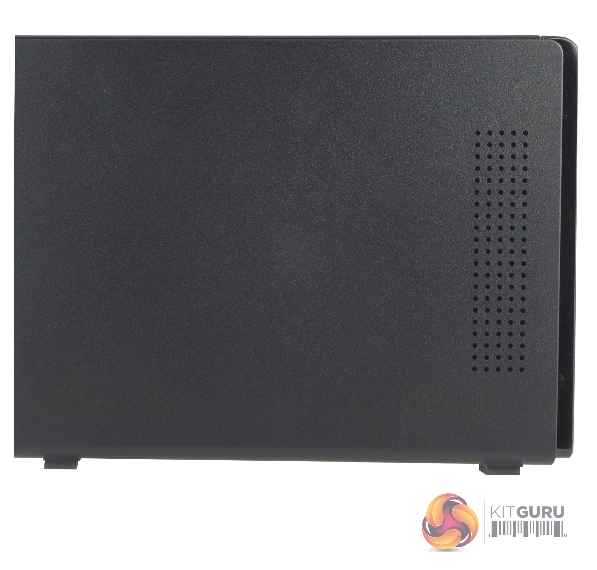 One side panel of the NAS has a series of holes drilled in it to help with keeping the unit cool while the other side panel has a sticker with the Cloud key details to help set the NAS up.