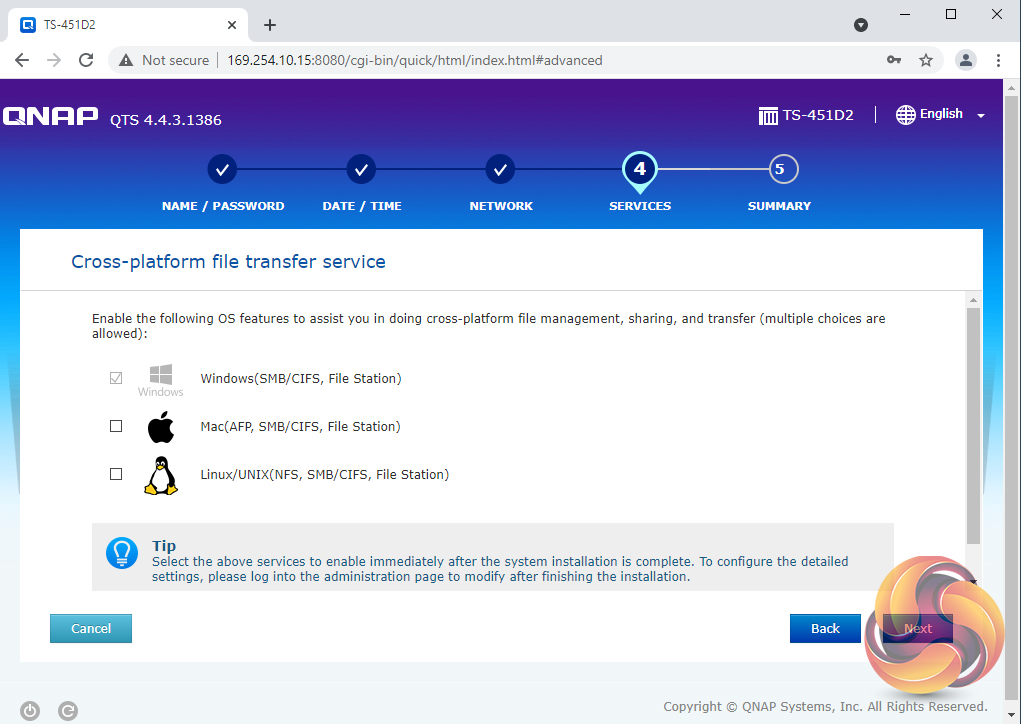 During the setup you can enable which OS cross-platform file management service you require; Windows (SMB/CIFS, File Station, FTP), Mac (SMB/CIFS, File Station, FTP) and Linux (NFS, SMB/CIFS, File Station, FTP).