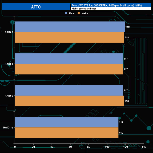 QNAP quotes Sequential throughput performance for the TS-451D2 as up to 220MB/s for reads and up to 224MB/s for writes with both LAN ports being used in Link Aggregation mode. With a single Ethernet connection (the way we tested the NAS), the official figures are 113MB/s reads and 112MB/s writes which we could confirm with the ATTO benchmark, with an average figure of 116.25MB/s for both read and writes for the five tested arrays.