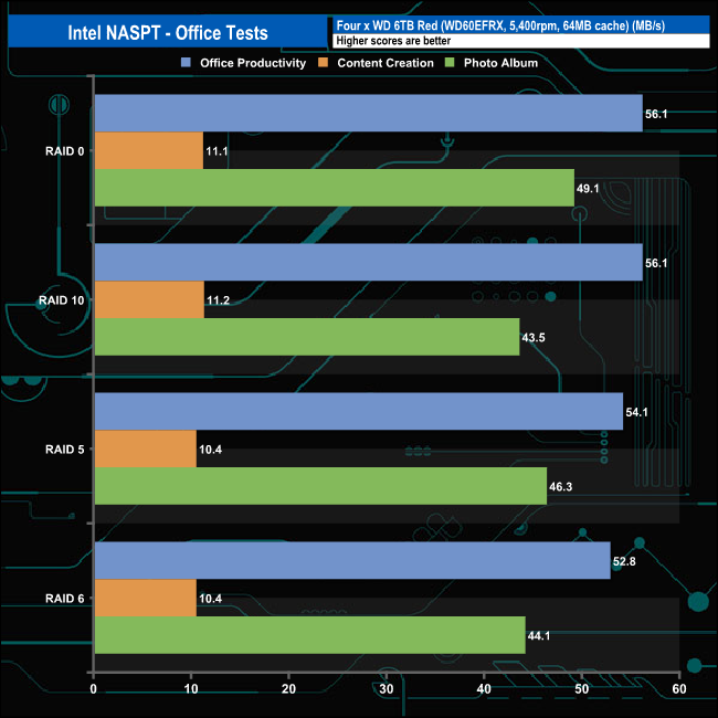 In the office tests, the NAS displayed strong performance with a pretty good level of consistency across the tested arrays. Best performance came in the Office Productivity test where it averaged 55.77MB/s. When dealing with the multitude of small files that make up the Photo Album test it averaged 45.75MB/s while in the Content Creation test it averaged 10.77MB/s.