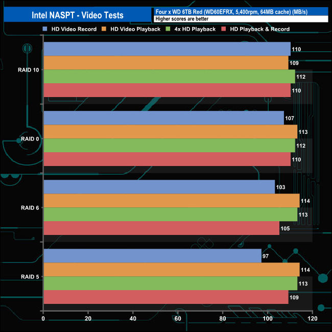 In the video tests of Intel’s NASPT benchmark, the TS-451D2-4G showed strong performance breaking the 100MB/s mark for all tests, with the exception of the HD Video Record test in a RAID 5 array where the result was 97MB/s.