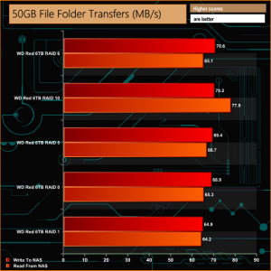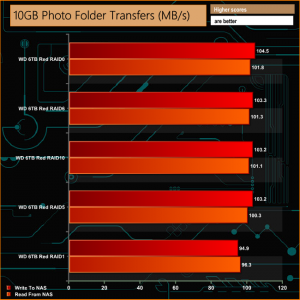 During our real-life folder transfer tests, the TS-453B shows pretty good consistency across all the arrays particularly when came to dealing with the contents of the media folders. When dealing with the 50GB file folder it averaged 68.8MB/s writing to the device and 67.84MB/s reading the data back. Both the Movie and Photo folder transfers delivered over 100MB/s performance for both reads and writes.
