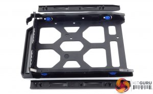 The drive trays are made of plastic and have grab handles moulded into them. The trays are held in place with small latches. Supporting both 3.5in and 2.5in drives, the larger drives are held in place by plastic strips that fit into grooves in the drive trays sides with pins that fit through the tray side and into the drives side mounting holes.