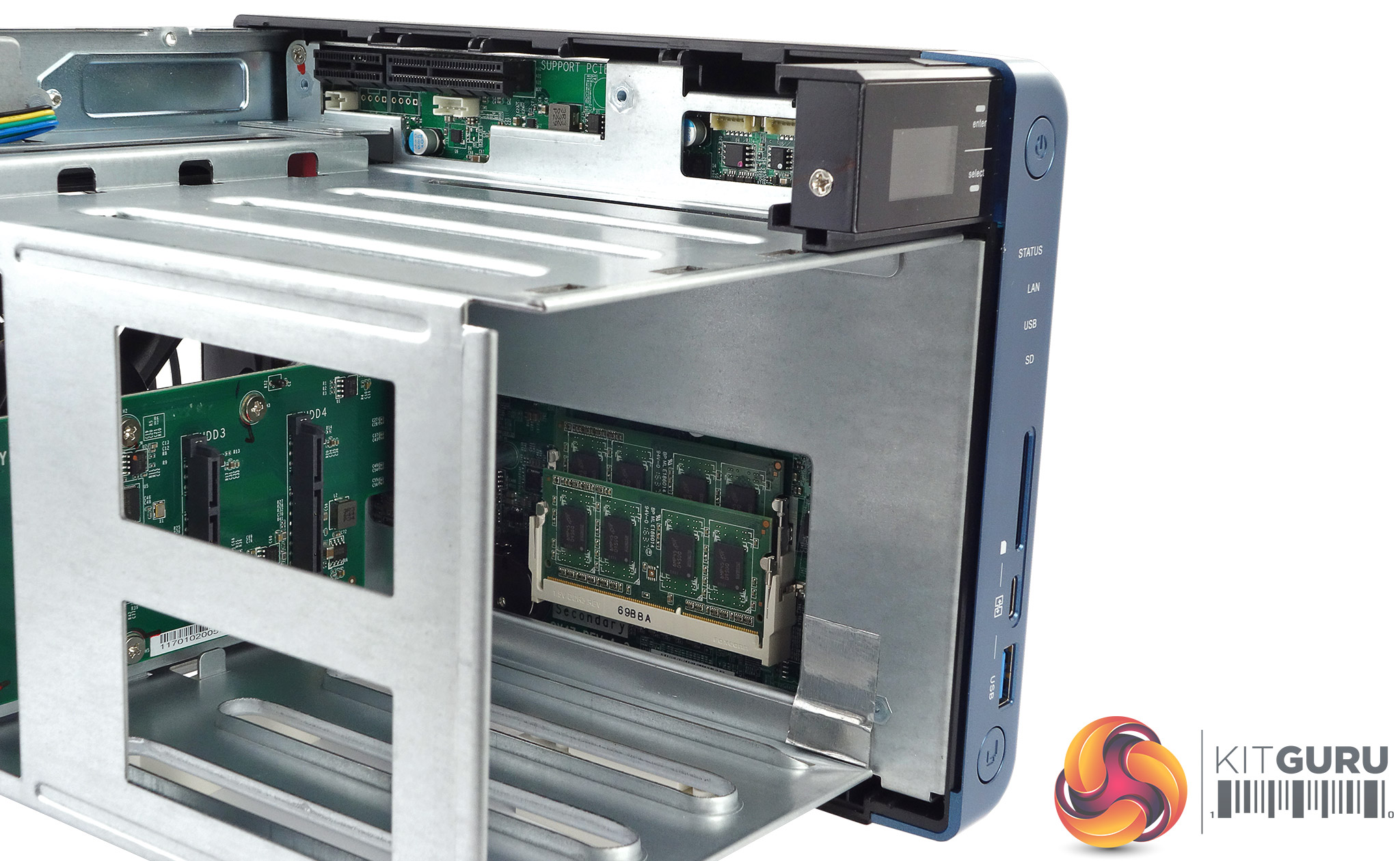 The PCIe slot sits at the top rear edge of the motherboard and can be accessed with the cover removed. The slot can be used to house a 10GbE network, WiFi or USB 3.1 cards. QNAP's QM2 card, a card that features dual M.2 slots and 10GbE connectivity supporting SSD caching and QNAP's Qtier auto-tiering technology for improved NAS performance is another option for the slot.