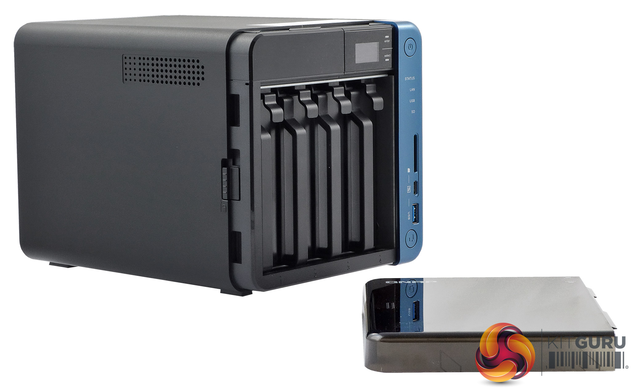 QNAP's TS- x53B series has a new distinctive design finished in black with a metallic blue-gray front bezel strip housing the power button, indicator LEDs and the front ports.