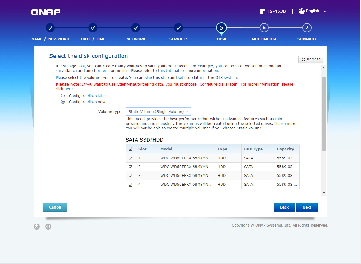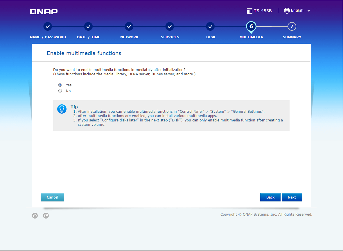 Whichever way you choose to start, it’s just a simple matter of following the install wizard. During the setup you can enable which OS cross-platform file management service you require; Windows (SMB/CIFS, File Station, FTP), Mac (SMB/CIFS, File Station, FTP) and Linux (NFS, SMB/CIFS, File Station, FTP). At this stage you can also load a few basic apps; Photo Station, Music Station, iTunes Server, DLNA Media Server and Download Station.