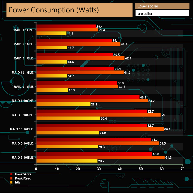 We tested the peak power consumption of the NAS at the wall during a run of CrystalDiskMark 5.0.2, as this version of the benchmark runs the read and write benchmark suites separately so it is easier to monitor what power the device is using during each function.