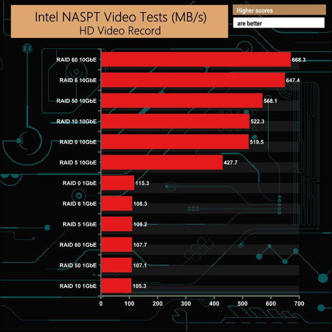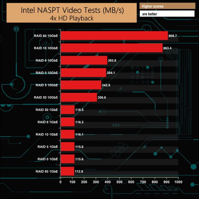 In the four Video tests of Intel's NASPT we used, the performance with the drives built into RAIDs 10 and 60 using a 10GbE connection was very, very impressive. The fastest figures for the two arrays came in the HD Video Playback test with 941MB/s in RAID 60 and 929MB/s in RAID 10. With a 1GbE connection the performance across the arrays is very consistent.