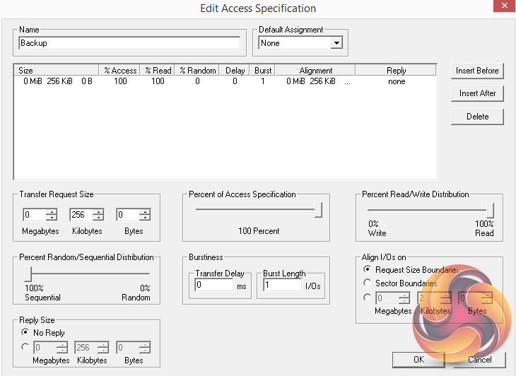 We set IOmeter up (as shown above) to test both backup and restore performance on a 100GB partition.