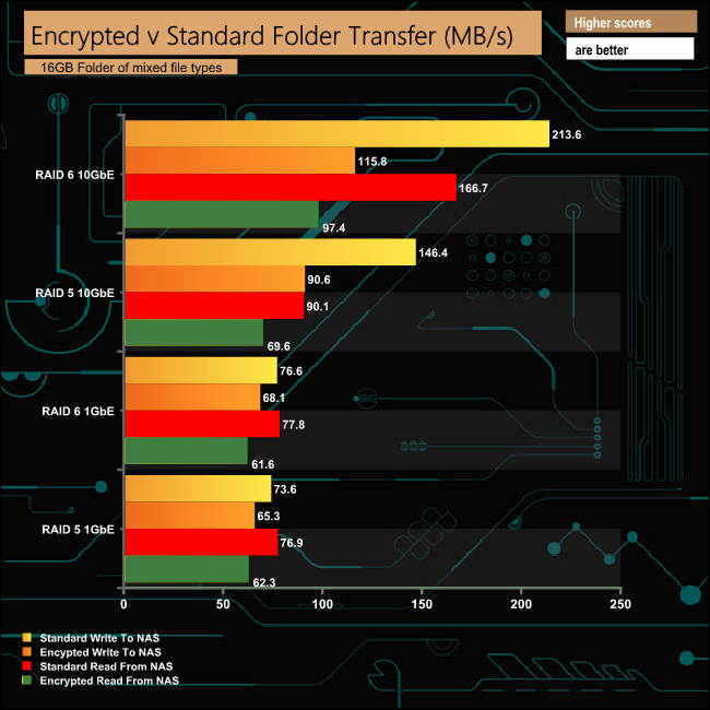 The integrated AES encryption engine of the TVS-673e works hard to lessen the effects of encrypted data transfers. It offers better write performance than read performance, losing just 8MB/s in RAID 6 and RAID 5 with a 1GbE connection as opposed to the 14.6MB/s and 16.2MB/s loss in read performance when in RAID 5 and 6 respectively.