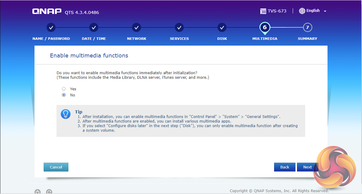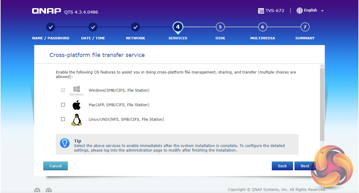 During the setup you can enable which OS cross-platform file management service you require; Windows (SMB/CIFS, File Station, FTP), Mac (SMB/CIFS, File Station, FTP) and Linux (NFS, SMB/CIFS, File Station, FTP). At this stage you can also load a few basic apps; Photo Station, Music Station, iTunes Server, DLNA Media Server and Download Station.