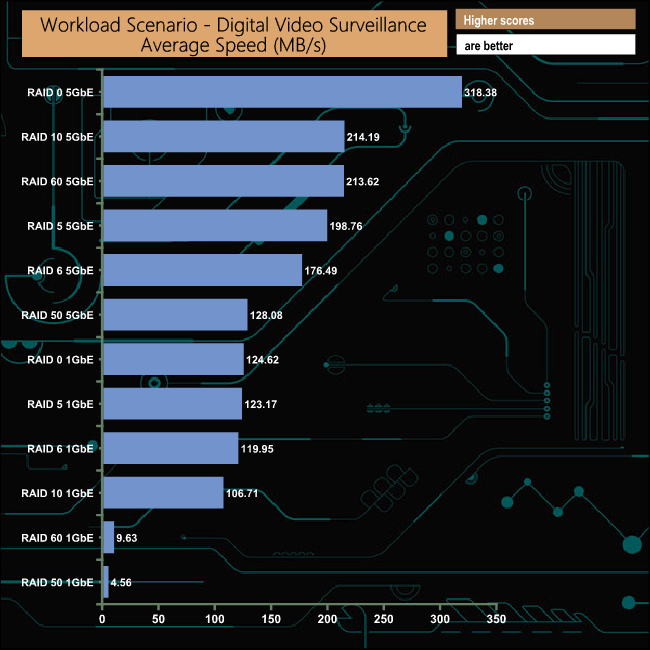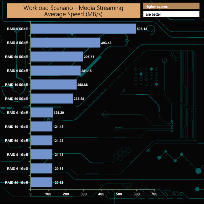 The fastest performance in the second group of workload scenarios came in the Media Streaming Test using a 5GbE connection and a RAID 0 array which gave an average speed of 595.13MB/s. The fastest performance with data protection also came in the Media Streaming Test, this time it was from a combination of a RAID 5 array and a 5GbE connection which produced a figure of 393.43MB/s.