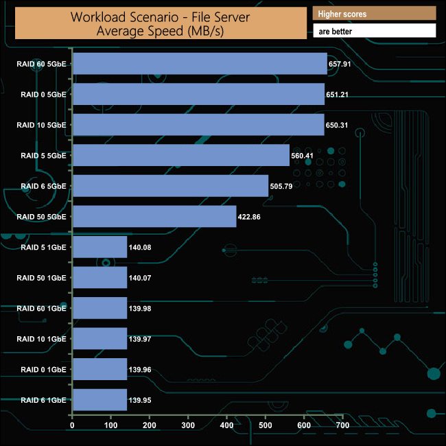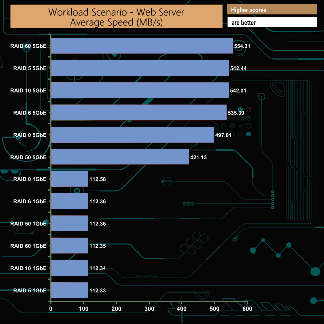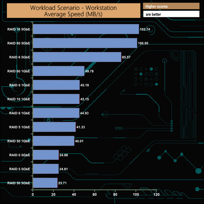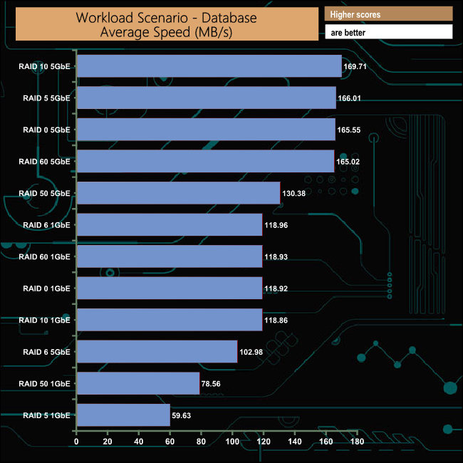 While the File and Web server tests produced much faster average speeds when using a 5GbE connection than the 1GbE connection as you might expect, the Database and Workstation tests produced results that were much more mixed between the two connection speeds.