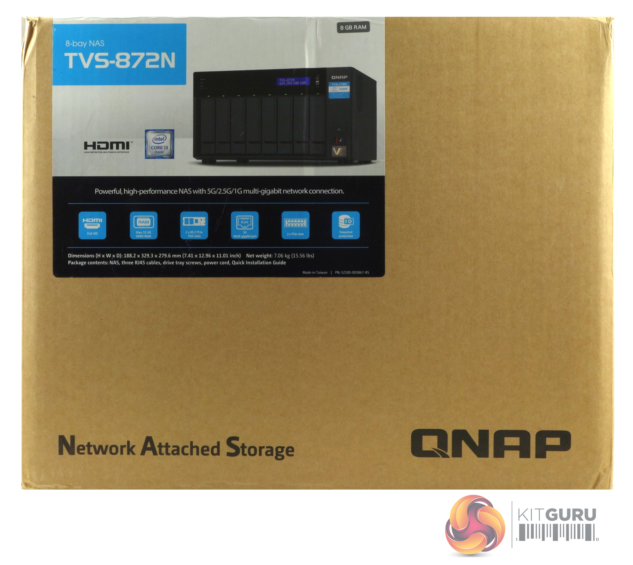 The TVS-872N comes in a large box with a clear image of the unit on the front. Above the image to the right is a sticker which displays the amount of memory the NAS uses. Under the image, there is a line of text and a row of icons describing some of the hardware features of the TVS-872N.